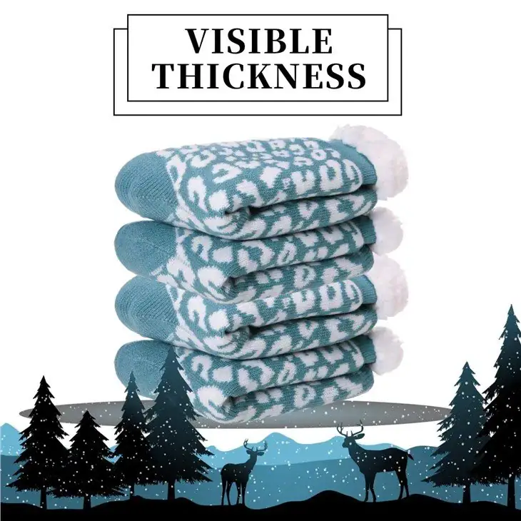 These trendy leopard print Sherpa socks feature premium wool lining for winter warmth, dirt-resistant material, machine-washable care (cold water only), and non-slip silicone rubber soles for safety.