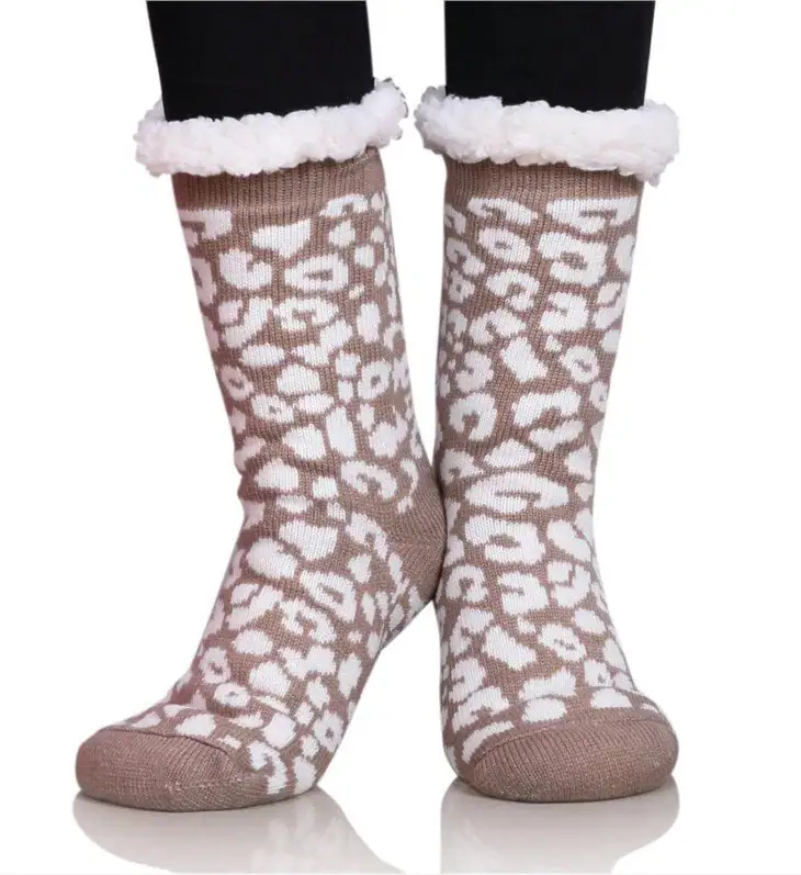 - Leopard print elements have been very popular in recent years, and keeping up with the trend we have also designed leopard print styles of Sherpa socks. The high quality wool lining of these socks will ensure that your feet are comfortable and will also ensure that your feet are not left cold during the cold winter months. Due to their colour and material, these socks are very resistant to dirt. You can machine wash them, but please do not iron them and we recommend washing them in cold water. High temperatures may result in shrinkage. We have also designed the socks with a silicone rubber grip on the sole to prevent slipping on smooth floors.