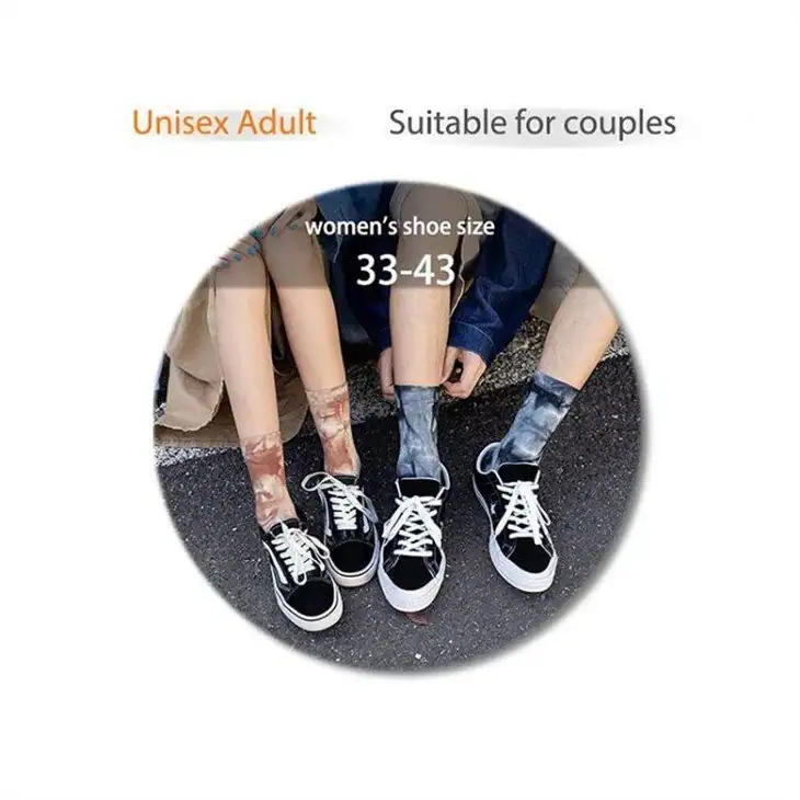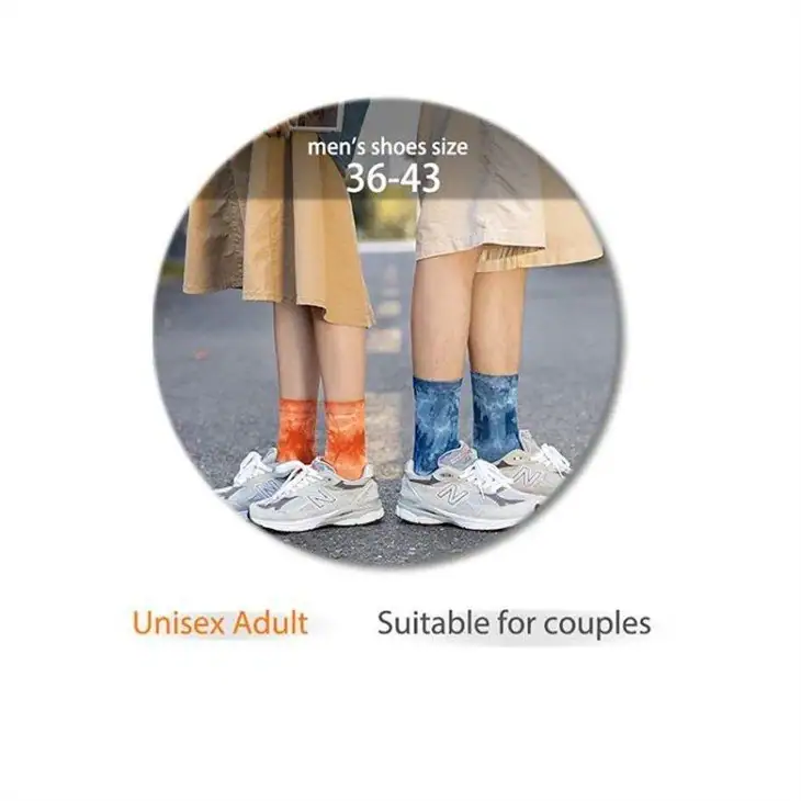 - These cosy tie-dye socks come in a total of five colours – brown, blue, orange, green and black – which are suitable for most people. The ankle height is perfect for all weather and all seasons and you can wear them with trousers or shorts and skirts etc. They are very versatile. The irregular shape of the tie-dye gives it a designer feel. The high quality cotton socks are machine washable and will not fade, please rest assured. These socks are available in men’s and women’s sizes, so you can wear them with couples’ clothes, parent-child clothes and more.