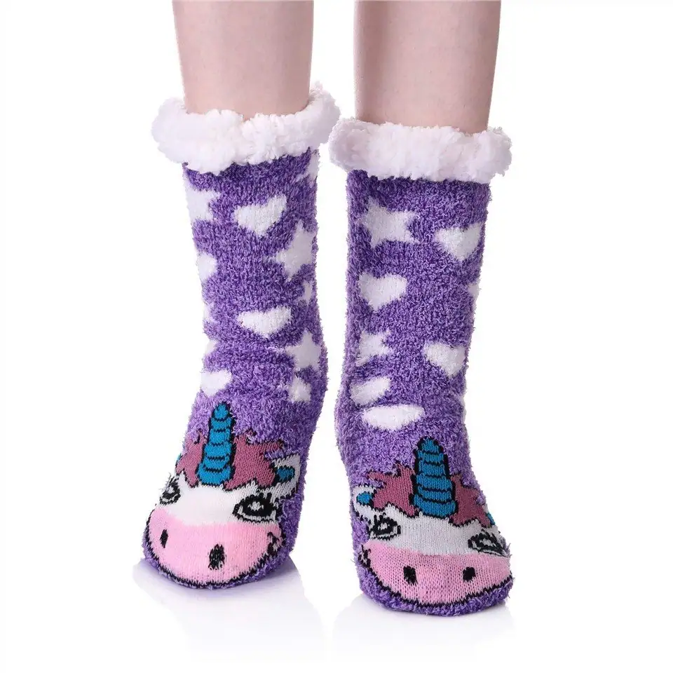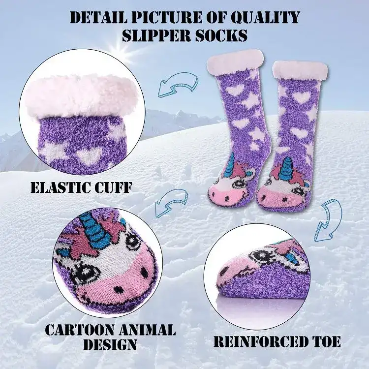 - The quality of our Sherpa socks for children is undoubtedly the best, with the thickest cotton lining and plush outer layer to give children the warmest experience. In addition to quality, the socks are also available in a variety of patterns. Our socks are purple with a unicorn image, which is more in line with children’s aesthetics, and we hope that the unicorn will bring them all the goodness they need. As children are so active, it is essential that they have a non-slip grip to give them the safest possible experience.