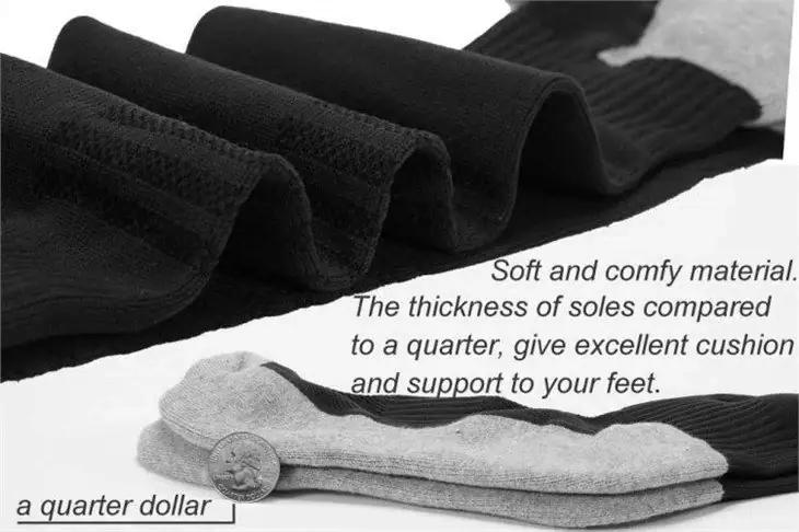 - CUSHIONED CREW SOCKS – Max cushioning place underfoot to help absorb shock and anti-blister protection. Strategic cushioning is soft and comfortable. Thick padding can relieve foot fatigue/soreness/swelling whlie standing, hiking, or working. REINFORCED TOE & HEEL – The heel and toe use thicker yarns for lasting durability, not easily broken, and can withstand multiple wears and washes. ARCH SUPPORT – Targeted compression zones provide varying levels of support, and stay in place. The ribbed arch band wraps your midfoot for a supportive feeling. Targeted Arch Compression Engineered with Just the Right Amount of Compression to Keep your Arch Stabile and Secure. Our Arch Support System also Prevents Bunching and Helps Keep Your Sock From Slipping. Cushioned Sole. Light Cushioning Provides Impact Protection without taking up too much Space inside your Shoes
