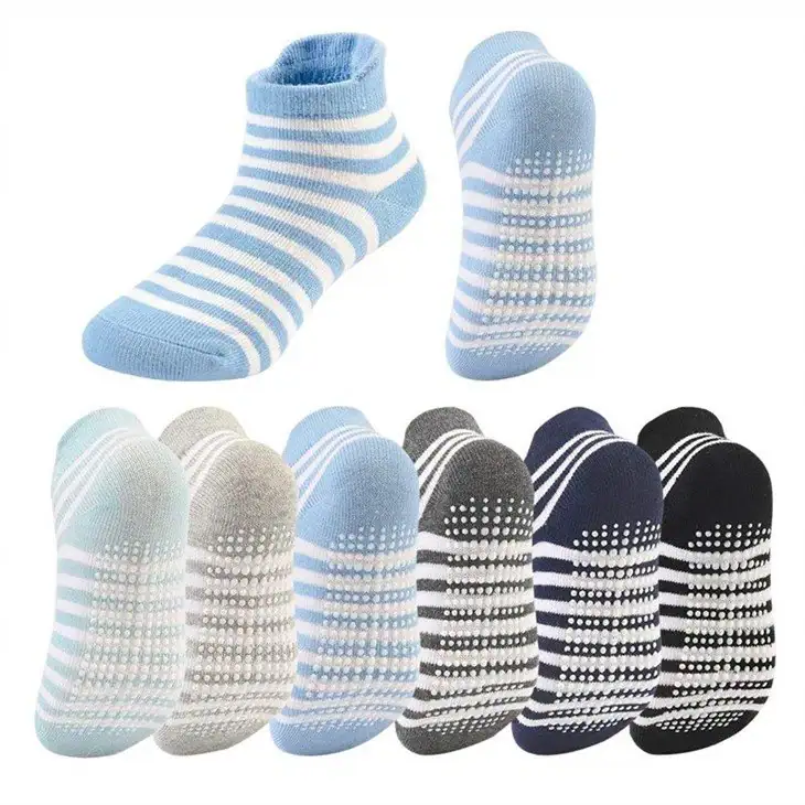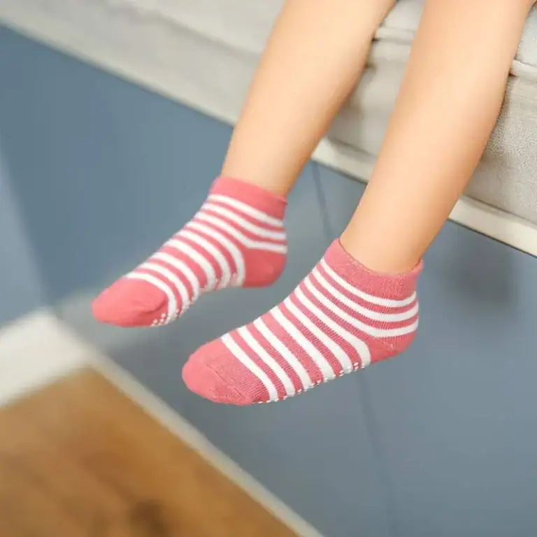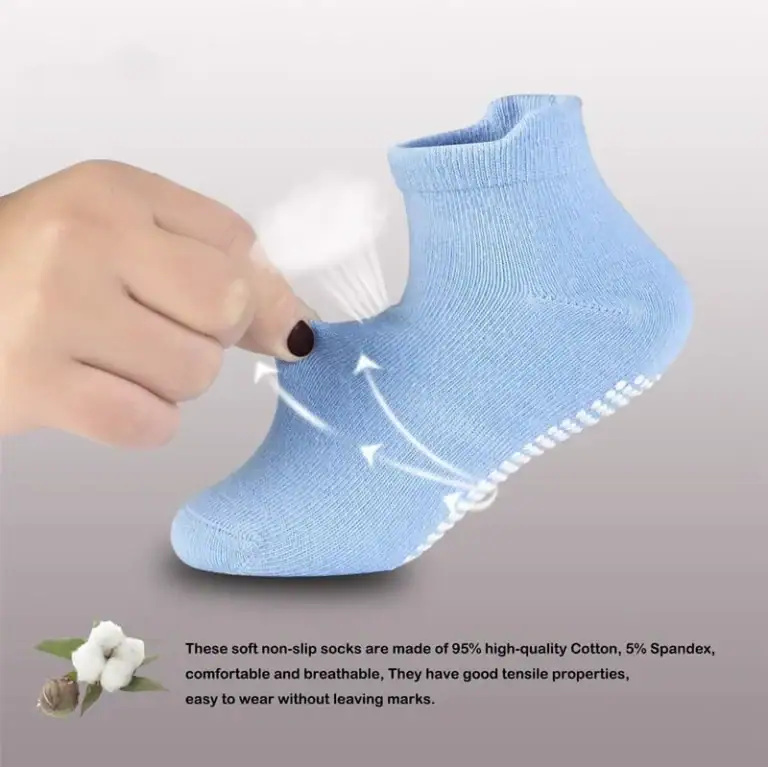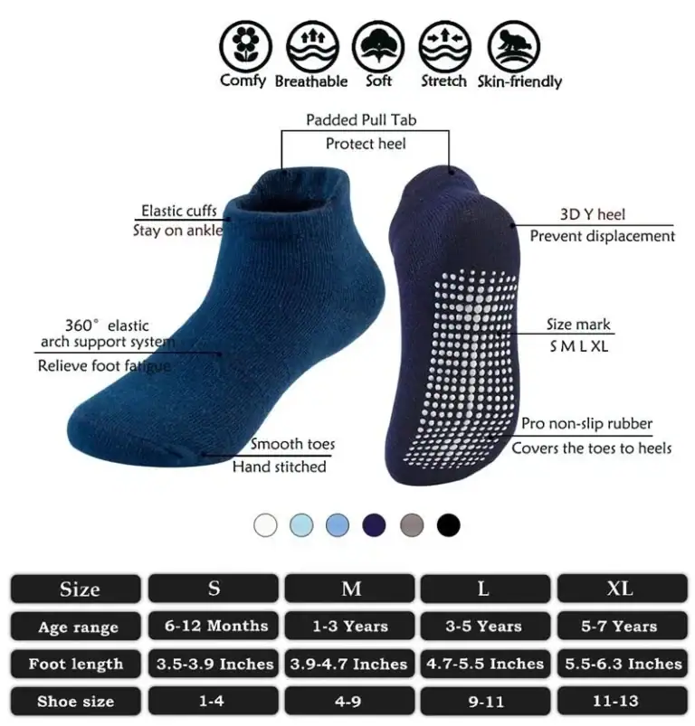 - Kids socks with grips have round rubber covers the toes to the heel, and the anti-skid rubber of the toddler grippy socks is in wide contact with the ground. When your children learn to walk and play indoors and around your house, can help toddlers adapt to hardwood floors and tiles. The cuffs of ankle socks are just above the ankles, can protect the ankles to prevent friction and blisters, The unique design and small lips on the back of the elastic cuffs, make it you children easier to wear, They will not leave marks on children’s ankles. 360 ° elastic arch support, can ease the instep and help reduce foot fatigue. The Y-shaped heel is combined with the support system to ensure that the socks are in the most suitable position during exercise and walking.