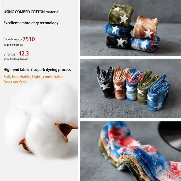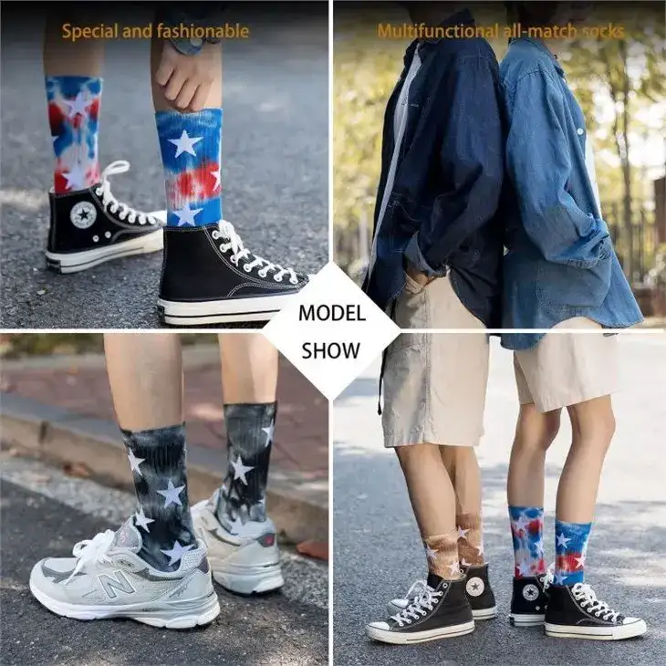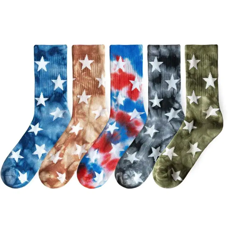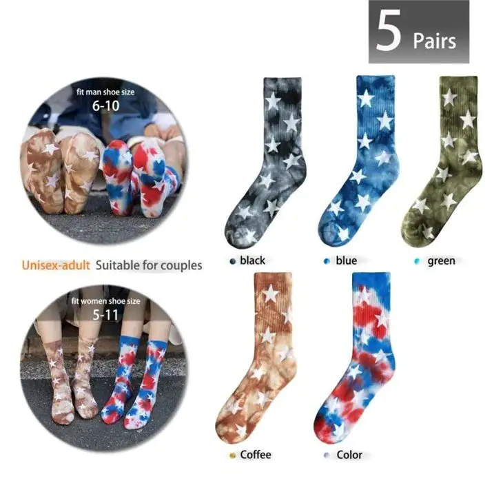 - The tie-dye socks on the market are basically unpatterned, so if you’re looking for a unique pair of tie-dye socks, then our socks with the pentagram jacquard are perfect for you. The five-pointed star is spread throughout the sock and when you put on your shoes, you can still reveal the original design, making you stand out in the crowd. These socks are gender neutral and can be worn by both men and women, you just need to choose the right size for you. Available in five colors to match your outfit.