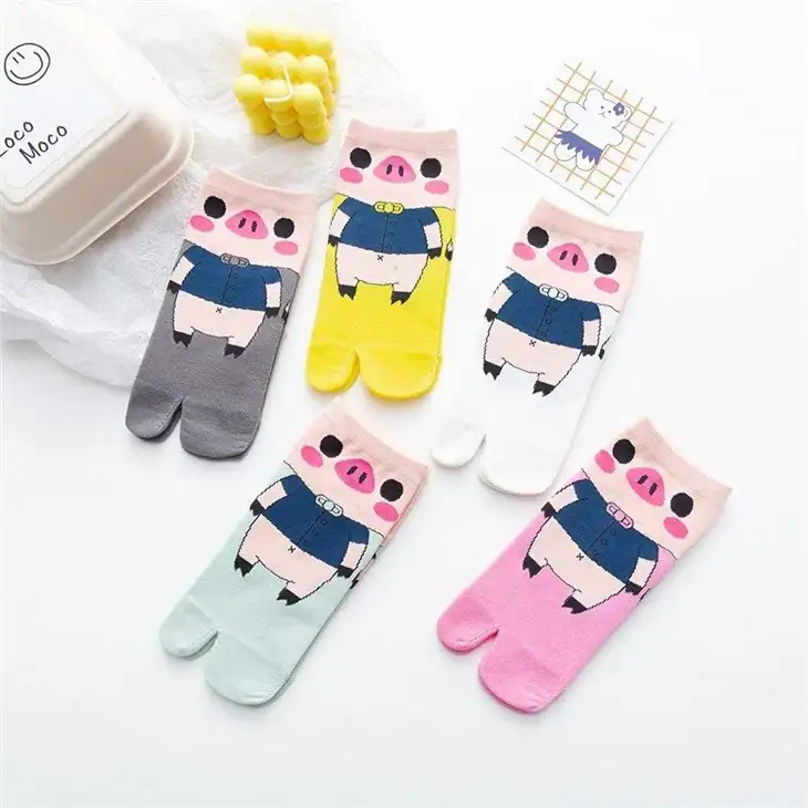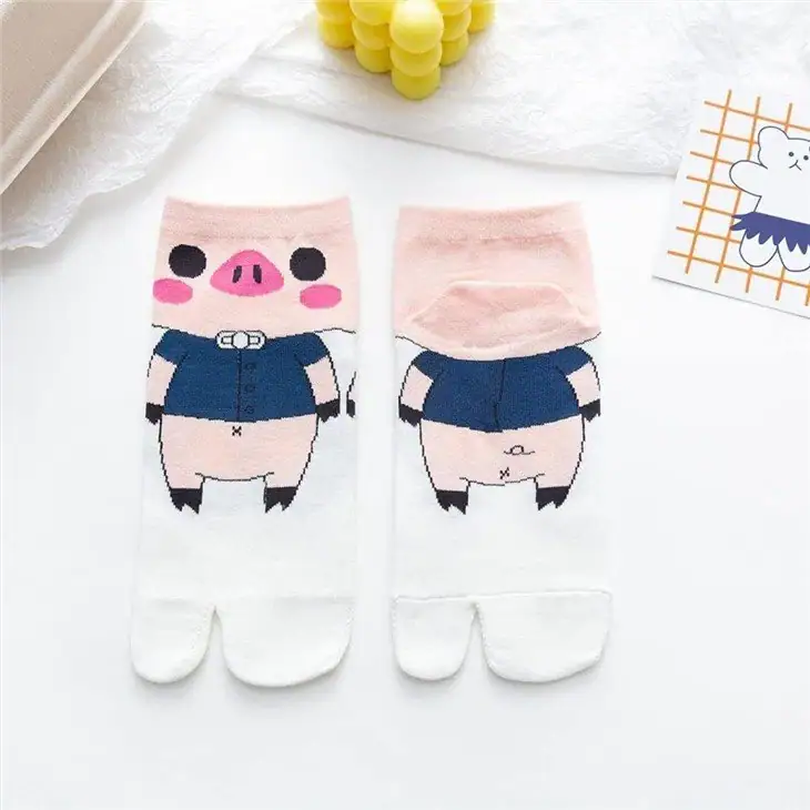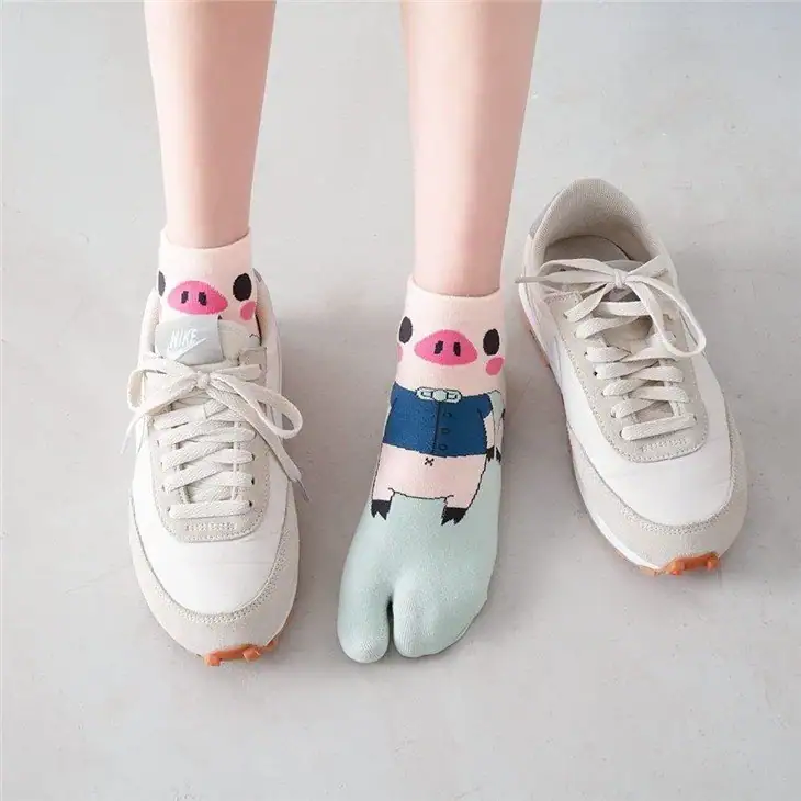 - hese cute two-toe socks for women are made of 90% cotton and 10% nylon. The women’s novelty cute socks are designed to be very soft, comfortable and stylish. The socks are stretchy, lightweight and wearable. It is gentle on your skin, suitable for indoor and outdoor activities and can be worn all day without discomfort. These two-toe socks are evenly sized to fit women’s US shoe sizes 5-8 or EU shoe sizes 35-39, providing a comfortable fit for every season. When you wear your sneakers, the cute pig face will show through for a playful, stylish outfit.