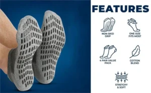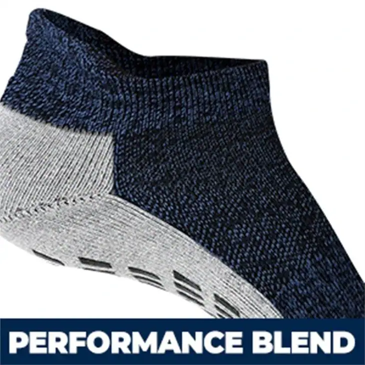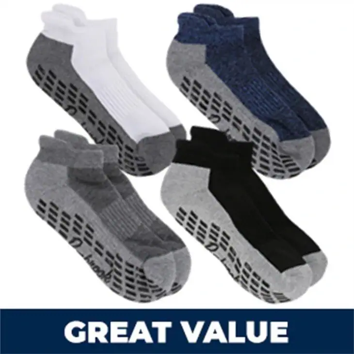 - Our men white trampolin socks’ gripping rubber treads provide safety and security. Our proprietary bottom design can show maximum traction grip on any surface. We use good quality grips which will not scratched your floors. We would like to make sure that our customers can be offered with the best comfort feelings which our socks offer. In order to show maximum performance and durability to our customer, we produce the socks by good cotton, fibers and elastics. Our special yarns blend resists odors, even in the hot summer, it can also textile foot odor.