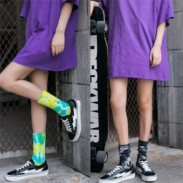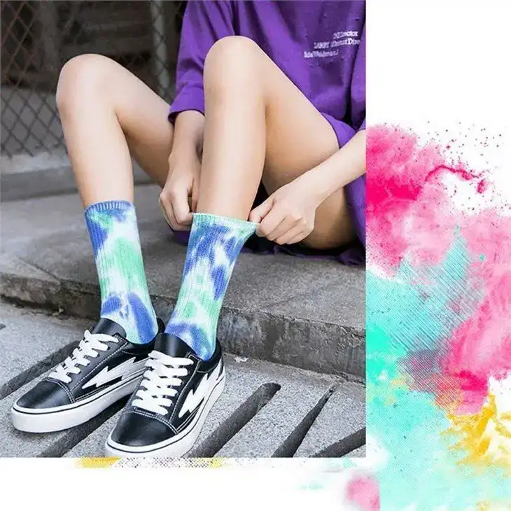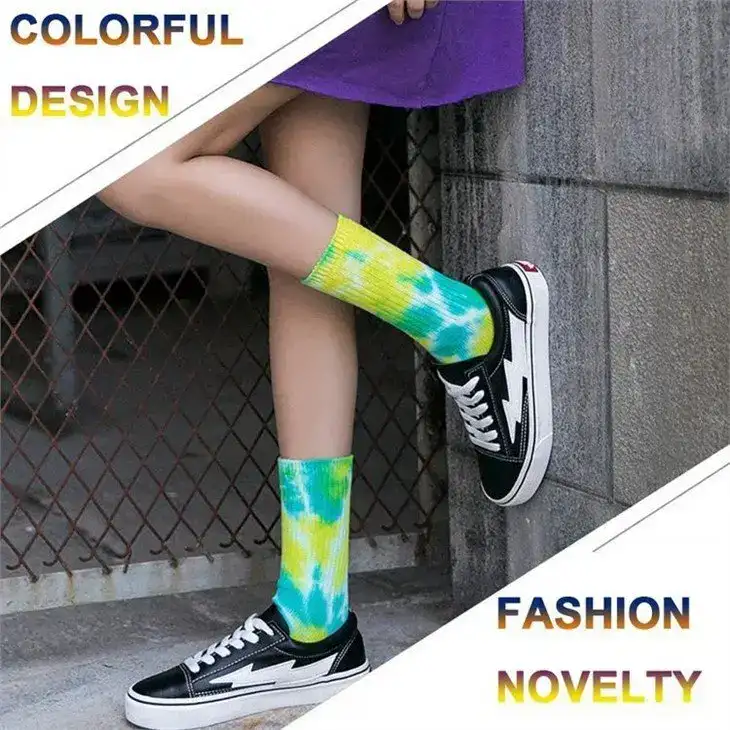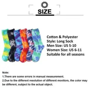 - For the socks to retain their colour perfectly, we recommend hand washing. We use a super soft blend of cotton that is breathable and sweat absorbent and high quality spandex to give the socks a great elasticity and abrasion resistance. The original tie-dye design makes these socks even more special. The vibrant colours with the retro style will make your outfit stand out and charming. The height of the socks to the calf is suitable to match all shoes, whether they are sneakers or snow boots, showing a bit of colour for all seasons.