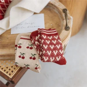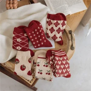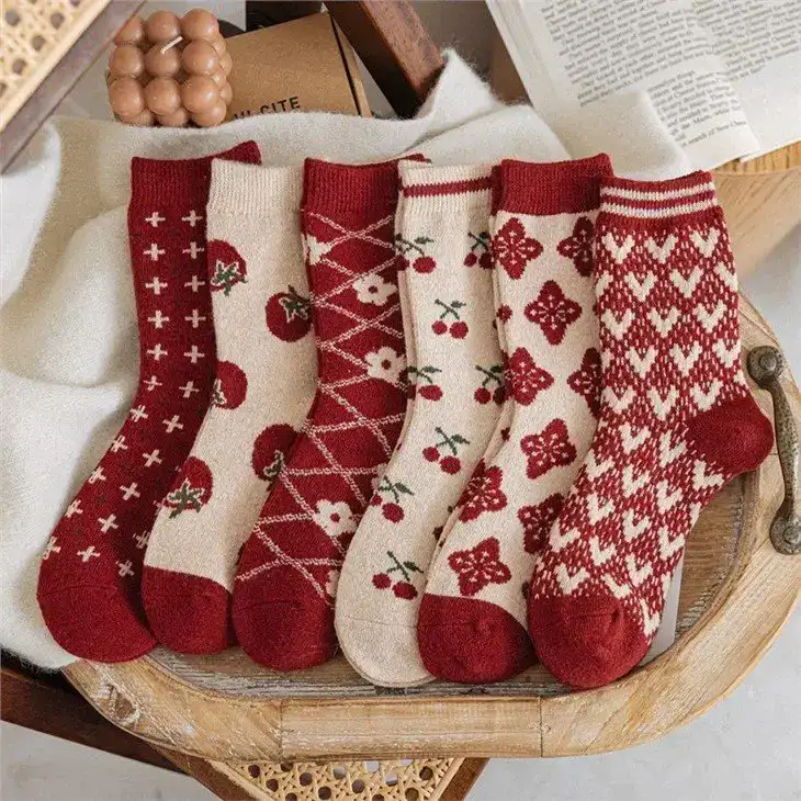These New Year-themed retro red wool socks with bow accents feature warm, thick wool fabric (breathable & non-slip) in vintage multi-color prints—ideal for winter wear and gifting.