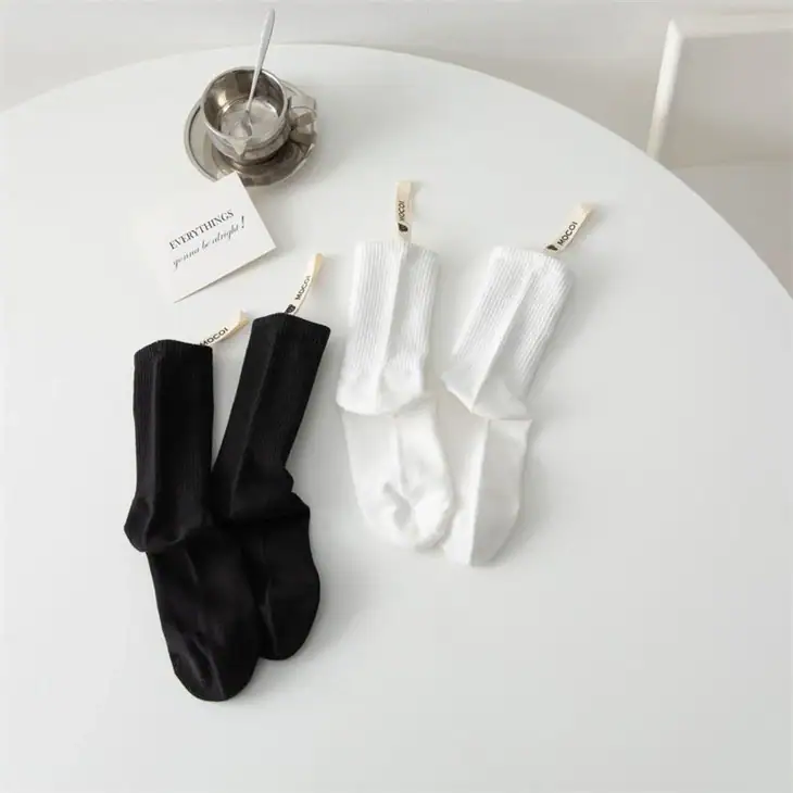 - This women’s Japanese style simple black and white solid color long socks are made of combed cotton, and there is a long cloth label on the heel. The cloth label is also woven from organic cotton, and the material is environmentally friendly.